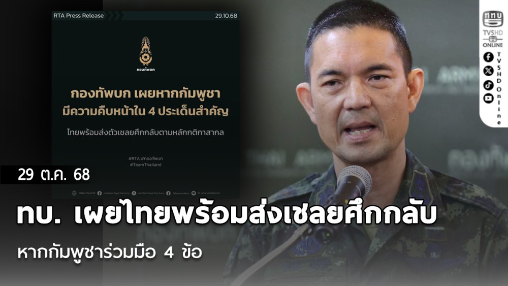 กองทัพบก เผยไทยพร้อมส่งตัวเชลยศึกกลับตามหลักกติกาสากล หากกัมพูชาร่วมมือดําเนินการใน 4 ข้อประเด็นสําคัญด้วยความจริงใจอย่างเป็นรูปธรรม