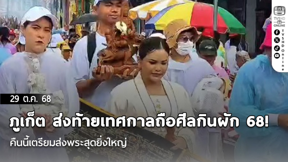 วันที่ 29 ตุลาคม 2568 เป็นวันสุดท้ายของประเพณีถือศีลกินผักจังหวัดภูเก็ต ประจําปี 2568 บรรยากาศการแห่พระรอบเมืองยังคงเป็นไปอย่างคึกคัก โดยเฉพาะขบวนแห่พระของศาลเจ้าซุ่ยบุ่นต๋อง หรือ ศาลเจ้าหล่อโรง ที่เคลื่อนขบวนออกสู่ถนนสายต่างๆ ในตัวเมืองภูเก็ต แม้จะมีสายฝนโปรยปรายลงมาอย่างต่อเนื่อง แต่ก็ไม่เป็นอุปสรรคต่อศรัทธาของประชาชนและนักท่องเที่ยวทั้งชาวไทยและชาวต่างชาติ ที่มารอรับขบวนแห่เพื่อขอพรและชมการแสดงอิทธิฤทธิ์ของม้าทรงกันอย่างเนืองแน่น