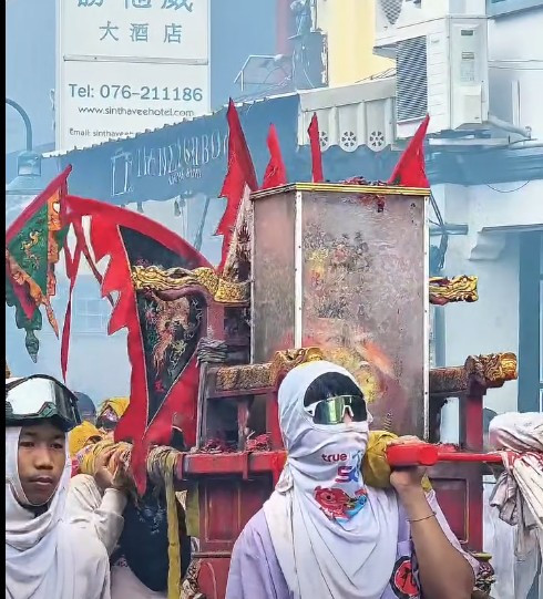 ม้าทรงที่เข้าร่วมขบวนยังคงแสดงความศรัทธาด้วยการใช้เหล็กแหลมและของมีคมต่างๆ ทั้งในและนอกตํานานทิ่มแทงตามร่างกาย ซึ่งเชื่อกันว่าเป็นการทรมานร่างกายเพื่อรับเคราะห์แทนผู้ถือศีลกินผัก ขบวนแห่พระได้เคลื่อนผ่านถนนสายสําคัญ มุ่งหน้าสู่สี่แยกชาร์เตอร์แบงก์ ซึ่งเป็นแลนด์มาร์คสําคัญของจังหวัด ก่อนจะไปสิ้นสุดที่ข้างสระน้ํา สะพานหิน เพื่อประกอบพิธีอัญเชิญกระถางธูปศักดิ์สิทธิ์กลับศาลเจ้า