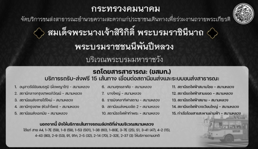 กระทรวงคมนาคม จัดมาตรการอํานวยความสะดวกประชาชนในการเดินทางเข้าถวายสักการะพระบรมศพเบื้องหน้าพระฉายาลักษณ์ สมเด็จพระนางเจ้าสิริกิติ์ พระบรมราชินีนาถ พระบรมราชชนนีพันปีหลวง ณ ศาลาสหทัยสมาคม ภายในพระบรมมหาราชวัง ตั้งแต่วันนี้ ถึงวันที่ 2 พฤศจิกายน 2568 โดยจัดบริการขนส่งสาธารณะทุกระบบให้บริการฟรี เพื่อให้ประชาชนสามารถเดินทางได้อย่างสะดวก ปลอดภัย และทั่วถึง