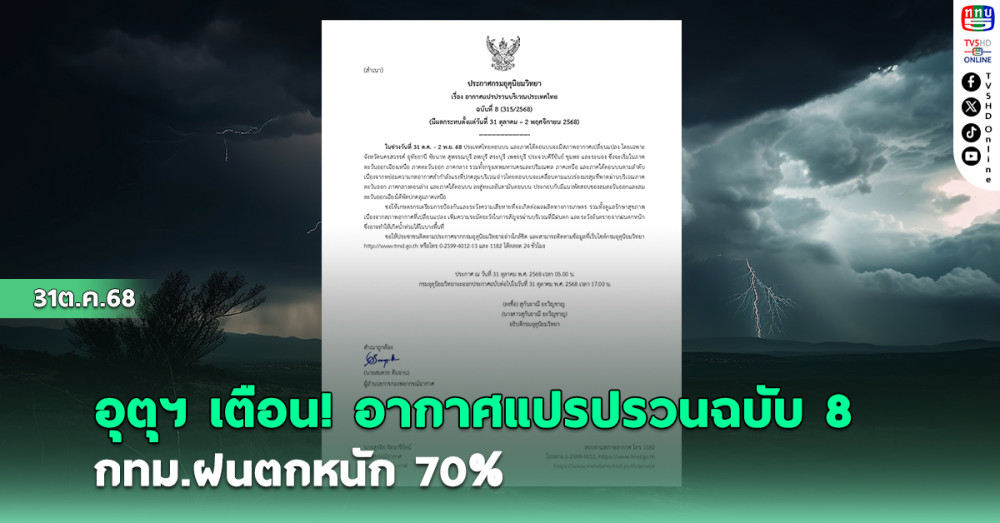 กรมอุตุนิยมวิทยา ประกาศ เรื่อง อากาศแปรปรวนบริเวณประเทศไทย ฉบับที่ 8 (315/2568)ในช่วงวันที่ 31 ต.ค. – 2 พ.ย. 68 ประเทศไทยตอนบน และภาคใต้ตอนบนจะมีสภาพอากาศเปลี่ยนแปลง โดยเฉพาะจังหวัดนครสวรรค์ อุทัยธานี ชัยนาท สุพรรณบุรี ลพบุรี สระบุรี เพชรบุรี ประจวบคีรีขันธ์ ชุมพร และระนอง ซึ่งจะเริ่มในภาคตะวันออกเฉียงเหนือ ภาคตะวันออก ภาคกลาง รวมทั้งกรุงเทพมหานครและปริมณฑล ภาคเหนือ และภาคใต้ตอนบนตามลําดับ เนื่องจากหย่อมความกดอากาศต่ํากําลังแรงที่ปกคลุมบริเวณอ่าวไทยตอนบนจะเคลื่อนตามแนวร่องมรสุมที่พาดผ่านบริเวณภาคตะวันออก ภาคกลางตอนล่าง และภาคใต้ตอนบน ลงสู่ทะเลอันดามันตอนบน ประกอบกับมีแนวพัดสอบของลมตะวันออกและลมตะวันออกเฉียงใต้พัดปกคลุมภาคเหนือ