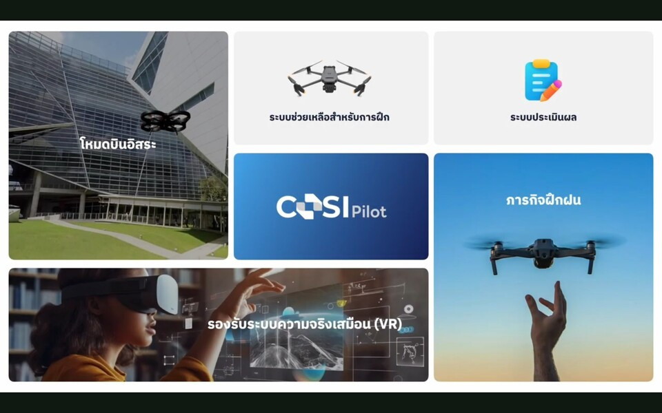 “CoSI Pilot” พัฒนาขึ้นเพื่อใช้เทคโนโลยี VR จําลองการฝึกบินโดรนเสมือนจริงตามมาตรฐาน ICAO ช่วยลดค่าใช้จ่าย ลดความเสี่ยงจากการฝึกจริง และสามารถประเมินสมรรถนะของผู้ฝึกได้อย่างแม่นยํา อีกทั้งยังเพิ่มฟังก์ชันการวัด “ทัศนคติของนักบิน” (Attitude) เพื่อส่งเสริมการตัดสินใจและความปลอดภัยในการบิน
