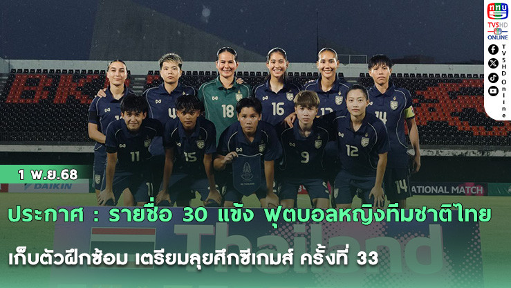 สมาคมกีฬาฟุตบอลแห่งประเทศไทย ในพระบรมราชูปถัมภ์ ประกาศรายชื่อ 30 นักฟุตบอลหญิงทีมชาติไทย เพื่อเก็บตัวฝึกซ้อม เตรียมความพร้อมก่อนทําการแข่งขันมหกรรมกีฬาซีเกมส์ ครั้งที่ 33 ที่ประเทศไทยเป็นเจ้าภาพ ระหว่างวันที่ 9-20 ธันวาคม 2568 ณ ชลบุรี สเตเดียม ภายใต้การคุมทัพของ “โค้ชหนึ่ง” หนึ่งฤทัย สระทองเวียน หัวหน้าผู้ฝึกสอน