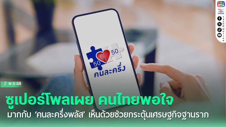 เมื่อวันที่ 2 พฤศจิกายน สํานักวิจัยซูเปอร์โพล สถาบันวิจัยความสุขชุมชนและความเป็นผู้นํา เปิดเผยรายงานผลการสํารวจ เรื่องมาตรการกระตุ้นเศรษฐกิจ “คนละครึ่งพลัส” จากกลุ่มตัวอย่างประชาชนทุกสาขาอาชีพทั่วประเทศ จํานวนทั้งสิ้น 1,248 ตัวอย่าง ดําเนินโครงการระหว่างวันที่ 29 ตุลาคม – 1 พฤศจิกายน 2568 ที่ผ่านมา เมื่อสอบถามความพึงพอใจต่อมาตรการกระตุ้นเศรษฐกิจ คนละครึ่ง พลัส โดยรวม พบว่า ประชาชนส่วนใหญ่ ร้อยละ 69.5 อยู่ในกลุ่ม “พอใจสูงสุด” (Top-2 Box ระดับ 9-10 คะแนน) สะท้อนถึงความรู้สึกเชิงบวกต่อมาตรการดังกล่าวว่า มีประโยชน์ต่อการจับจ่ายใช้สอยและการหมุนเวียนเศรษฐกิจจริง
