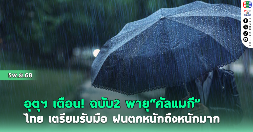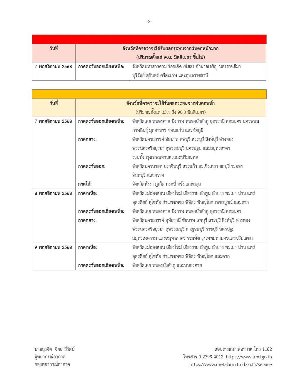 จากอิทธิพลของพายุ “คัลแมกี” ส่งผลให้ในช่วงวันที่ 7–9 พ.ย. 68 ประเทศไทยตอนบนมีฝนเพิ่มขึ้น และมีฝนตกหนักถึงหนักมากบางพื้นที่ โดยจะเริ่มจากบริเวณภาคตะวันออกเฉียงเหนือ ภาคตะวันออก ภาคกลาง และภาคเหนือตามลําดับ ขอให้ประชาชนในบริเวณดังกล่าวระวังอันตรายจากฝนตกหนักถึงหนักมาก และฝนที่ตกสะสม ซึ่งอาจทําให้เกิดน้ําท่วมฉับพลัน น้ําป่าไหลหลาก และน้ําล้นตลิ่ง โดยเฉพาะพื้นที่ลาดเชิงเขาใกล้ทางน้ําไหลผ่าน พื้นที่ลุ่ม และพื้นที่น้ําท่วมขัง สําหรับเกษตรกรควรเตรียมการป้องกันและระวังความเสียหายที่จะเกิดต่อผลผลิตทางการเกษตร