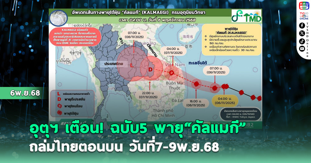 ประกาศกรมอุตุนิยมวิทยา เรื่อง พายุ “คัลแมกี” และฝนตกหนักถึงหนักมากบริเวณประเทศไทย ฉบับที่ 5 (325/2568) เมื่อเวลา 04.00 น. ของวันนี้ (6 พ.ย. 68) พายุไต้ฝุ่น “คัลแมกี” (KALMAEGI) บริเวณทะเลจีนใต้ มีศูนย์กลางอยู่ห่างประมาณ 510 กิโลเมตร ทางตะวันออกเฉียงใต้ของเมืองกวีเญิน ประเทศเวียดนาม หรือที่ละติจูด 13.2 องศาเหนือ ลองจิจูด 114.0 องศาตะวันออก ความเร็วลมสูงสุดใกล้ศูนย์กลางประมาณ 150 กิโลเมตรต่อชั่วโมง กําลังเคลื่อนตัวทางทิศตะวันตกค่อนทางเหนือเล็กน้อย ด้วยความเร็วประมาณ 30 กิโลเมตรต่อชั่วโมง