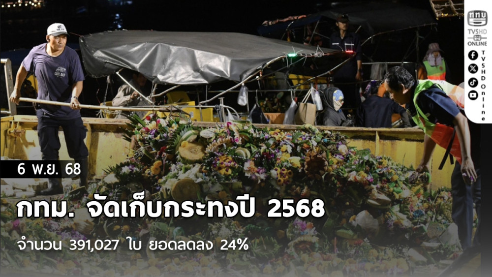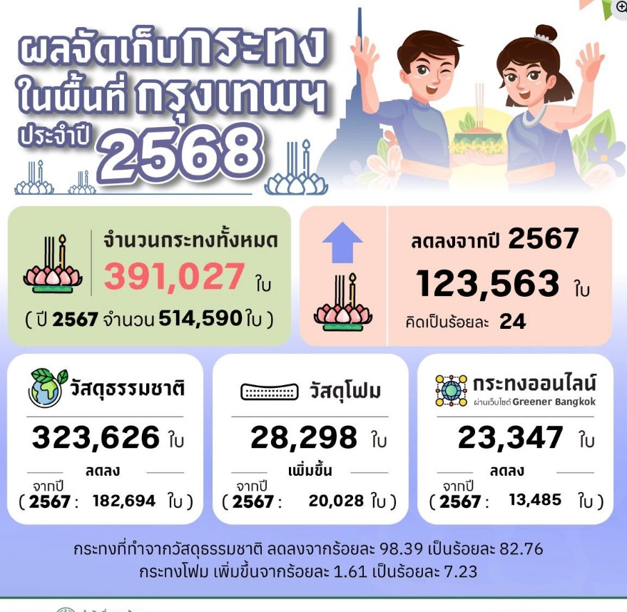 กทม. จัดเก็บกระทงปี 2568 จํานวน 391,027 ใบ ยอดลดลง 24% ใช้วัสดุธรรมชาติ 82.76% ลอยกระทงออนไลน์ 23,347 ใบ