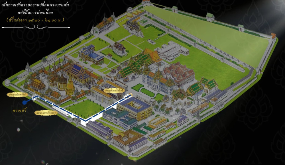 สําหรับประชาชนที่เดินทางเข้ากราบพระบรมศพ ณ พระที่นั่งดุสิตมหาปราสาท ในพระบรมมหาราชวัง หลังเวลา 15.30 น. จนถึงเวลา 21.00 น. เมื่อเข้าประตูมณีนพรัตน์ จะเดินเลี้ยวขวา ผ่านแผนกแพทย์หลวง เลี้ยวซ้ายแยกกองรักษาการณ์วิเศษไชยศรี เข้าถนนจักรีจรัล ผ่านประตูพิมานไชยศรี เลี้ยวขวาหน้าพระที่นั่งจักรีมหาปราสาท เข้าสู่พระที่ดุสิตมหาปราสาท ด้านกําแพงฝั่งทิศตะวันออก ขึ้นกราบพระบรมศพตามคําแนะนําของเจ้าหน้าที่สํานักพระราชวัง เสร็จแล้ว เมื่อลงจากพระที่นั่งดุสิตมหาปราสาท จะเดินออกทางกําแพงแก้วฝั่งทิศตะวันตก เดินออกประตูเทวาภิรมย์ ข้ามไปยังท่าราชวรดิฐ โดยมีจะเจ้าหน้าที่จิตอาสาและเจ้าหน้าที่ตํารวจจัดรถรางไฟฟ้าให้บริการกลับไปส่งที่สนามหลวง...