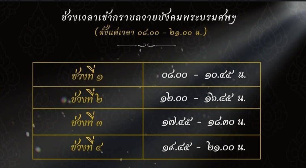 สํานักพระราชวังกําหนดให้ประชาชนสามารถเข้าถวายสักการะพระบรมศพ ใน 4 ช่วงเวลา ดังนั้น ช่วงที่ 1 เวลา 08.00-10.45 น. ช่วงที่ 2 เวลา 12.00-16.45 น. ช่วงที่ 3 เวลา 17.45-18.30 น. และช่วงที่ 4 เวลา 19.45-21.00 น.