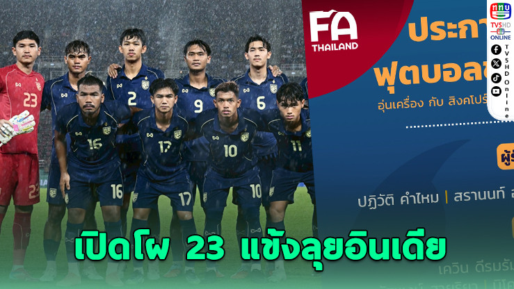 สมาคมกีฬาฟุตบอลแห่งประเทศไทยฯ ประกาศรายชื่อ 23 นักฟุตบอลชายทีมชาติไทย รุ่นอายุไม่เกิน 23 ปี ที่จะลงทําศึกอุ่นเครื่องกับทีมชาติอินเดีย U-23 ช่วงฟีฟ่าเดย์ระหว่างวันที่ 10–18 พฤศจิกายน 2568 เพื่อเตรียมความพร้อมก่อนลุยมหกรรมกีฬาซีเกมส์ภายใต้การคุมทีมของ “โค้ชวัง” ธวัชชัย ดํารงอ่องตระกูล