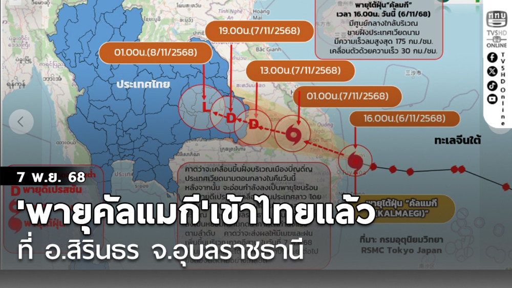วันที่ 7 พฤศจิกายน 2568 กรมอุตุนิยมวิทยา รายงานว่า เมื่อเวลา 07.00 น. วันนี้ พายุคัลแมกี อ่อนกําลังเป็นดีเปรสชันอยู่ที่เมืองจําปาสักตอนล่าง ประเทศลาว คาดจะเข้า อ. สิรินธร จ.อุบลราชธานี ช่วง 09.00-10.00 น. พายุเคลื่อนทางตะวันตกด้วยความเร็ว 30 กิโลเมตรต่อชั่วโมง