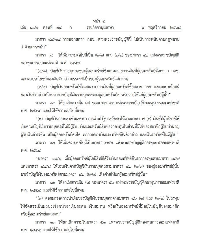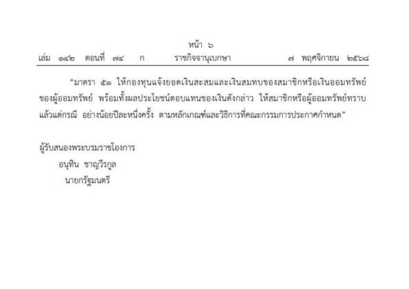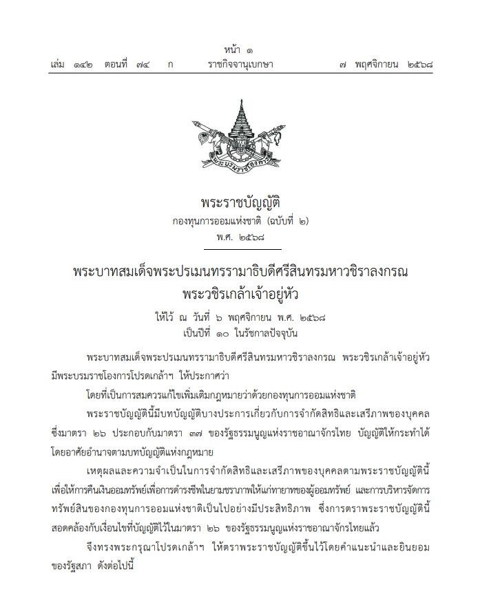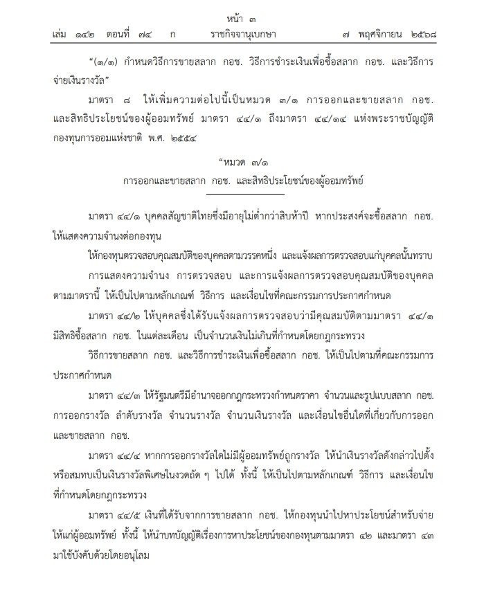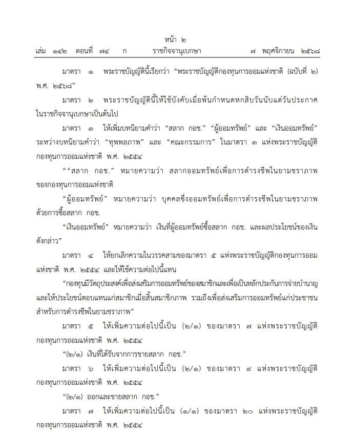ราชกิจจานุเบกษาเผยแพร่พระราชบัญญัติกองทุนการออมแห่งชาติ (ฉบับที่ 2) พ.ศ.2568 เปิดทางกองทุนการออมแห่งชาติ (กอช.) ออก “สลากออมทรัพย์เพื่อการดํารงชีพในยามชราภาพ” หรือ “สลาก กอช.” อย่างเป็นทางการ กฎหมายมีผลหลังประกาศ 60 วัน โดยคาดเริ่มจําหน่ายงวดแรกช่วงเดือนมกราคม 2569