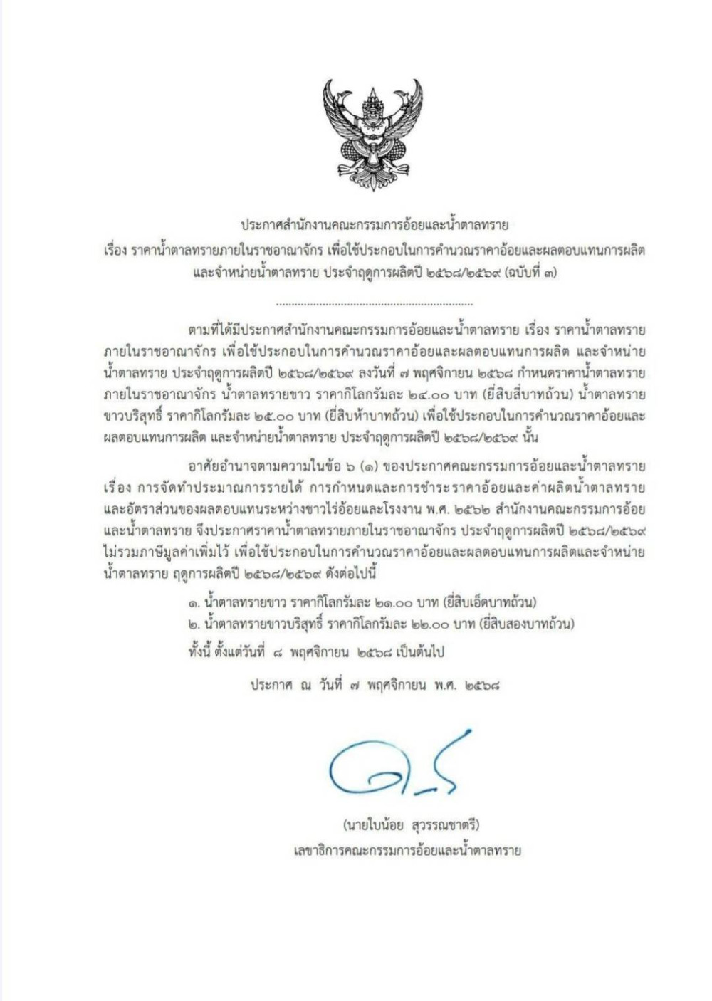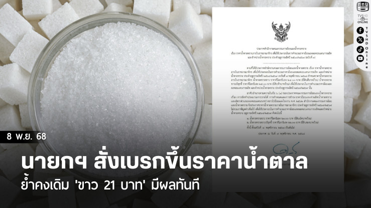 ก่อนหน้านี้ สํานักงานคณะกรรมการอ้อยและน้ําตาลทราย โดย นายใบน้อย สุวรรณชาตรี เลขาธิการฯ ได้ลงนามในประกาศปรับขึ้นราคาน้ําตาลทราย เพื่อให้สอดคล้องกับต้นทุนการผลิตและนําส่วนต่างไปคํานวณเป็นรายได้ให้ชาวไร่อ้อย โดยมีผลตั้งแต่วันที่ 8 พฤศจิกายน 2568 ดังนี้: