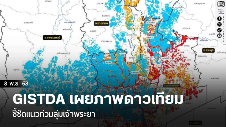 วันที่ 8 พ.ย.68 - สํานักงานพัฒนาเทคโนโลยีอวกาศและภูมิสารสนเทศ (GISTDA) เผยข้อมูลล่าสุดจากภาพถ่ายดาวเทียม พบสัญญาณน้ําท่วมขยายวงใน ลุ่มน้ําเจ้าพระยา หลังมีการระบายน้ําจาก เขื่อนเจ้าพระยา จังหวัดชัยนาท เพื่อรองรับมวลน้ําเหนือที่กําลังไหลลงมาสมทบ