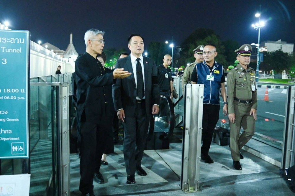 เมื่อนายกรัฐมนตรีเดินทางมาถึง ได้เดินตรวจเยี่ยมการจัดเตรียมพื้นที่บริเวณสนามหลวง โดยเริ่มจากเต็นท์จุดคัดกรอง ซึ่งมีจุดพักคอยอํานวยความสะดวกให้กับประชาชน อาทิ หน่วยบริการทางการแพทย์จากศูนย์เอราวัณ สํานักการแพทย์ กรุงเทพมหานคร จุดบริการอาหารพระราชทาน จากนั้นนายกรัฐมนตรีได้เดินต่อไปยังอุโมงค์หน้าพระลาน ซึ่งเป็นจุดตรวจค้นกระเป๋าสัมภาระ และผ่านเครื่องสแกน