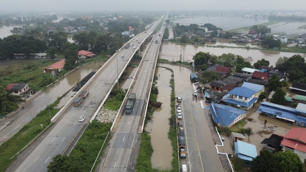 ในหลายพื้นที่ระดับน้ํายังคงท่วมสูง โดยเฉพาะบริเวณถนนสาย อยุธยา–ปทุมธานี (หมายเลข 347) ใต้สะพานข้ามแม่น้ําเจ้าพระยา หมู่ 2 ตําบลบ้านป้อม อําเภอพระนครศรีอยุธยา น้ําล้นตลิ่งเข้าท่วมจุดกลับรถระดับสูงกว่า 30–40 เซนติเมตร รถยนต์ขนาดเล็กไม่สามารถสัญจรได้ ส่งผลให้การจราจรติดขัดและบางช่วงต้องปิดการจราจรชั่วคราว ขณะเดียวกัน ร้านอาหารริมแม่น้ําเจ้าพระยาหลายแห่งต้องปิดให้บริการชั่วคราว เช่น ร้าน “แอบแซ่บ” ที่ถูกน้ําท่วมสูงหลายเมตร แม้จะย้ายโต๊ะเก้าอี้ขึ้นริมถนนแต่ก็ไม่พ้นน้ํา ระดับน้ําเพิ่มขึ้นจนต้องขนของหนีน้ําหลายรอบ