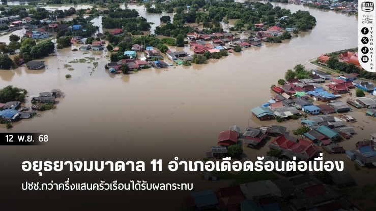 ผู้สื่อข่าวรายงานสถานการณ์น้ําท่วม ณ วันที่ 11พ.ย.68 จังหวัดพระนครศรีอยุธ ยา ยังคงวิกฤต หลังจากเขื่อนเจ้าพระยา จังหวัดชัยนาท ปรับการระบายน้ําเพิ่มสูงขึ้นที่อัตรา 2,900 ลูกบาศก์เมตรต่อวินาที ส่งผลให้ระดับน้ําในแม่น้ําเจ้าพระยาและแม่น้ําสายหลักเพิ่มสูงต่อเนื่อง จนเอ่อล้นเข้าท่วมพื้นที่ชุมชน บ้านเรือน และเส้นทางสัญจรในหลายจุดของจังหวัด มีพื้นที่ได้รับผลกระทบน้ําท่วมแล้ว 11 อําเภอ 143 ตําบล 945 หมู่บ้าน ประชาชนเดือดร้อนกว่า 59,490 ครัวเรือน โดยอําเภอที่ยังคงมีน้ําท่วมสูง ได้แก่ อําเภอเสนา, ผักไห่, บางบาล, บางไทร, พระนครศรีอยุธยา, บางปะอิน, บางปะหัน, บางซ้าย, บ้านแพรก, ลาดบัวหลวง และล่าสุดอําเภอมหาราช โดยมีรายงานผู้เสียชีวิต รวม 14 ราย จากพื้นที่อําเภอเสนา ผักไห่ บางบาล บางไทร และพระนครศรีอยุธยา