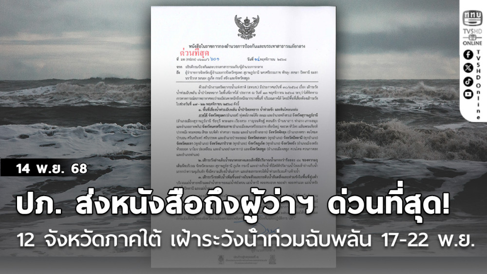 กองอํานวยการป้องกันและบรรเทาสาธารณภัยกลาง (กอปภ.ก.) ได้มีหนังสือราชการด่วนที่สุด ลงวันที่ 14 พฤศจิกายน 2568 แจ้งไปยังผู้ว่าราชการจังหวัด 12 จังหวัดในพื้นที่ภาคใต้ ให้เตรียมการป้องกันและรับมือสถานการณ์อุทกภัยที่อาจเกิดขึ้น