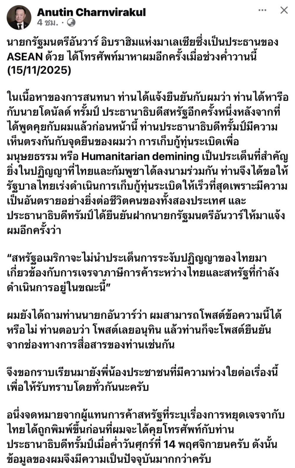 โดยข้อความในโพสต์ มีรายละเอียดว่า ”นายกรัฐมนตรีอันวาร์ อิบราฮิมแห่งมาเลเซียซึ่งเป็นประธานของ ASEAN ด้วย ได้โทรศัพท์มาหาผมอีกครั้งเมื่อช่วงค่ําวานนี้ (15/11/2025)