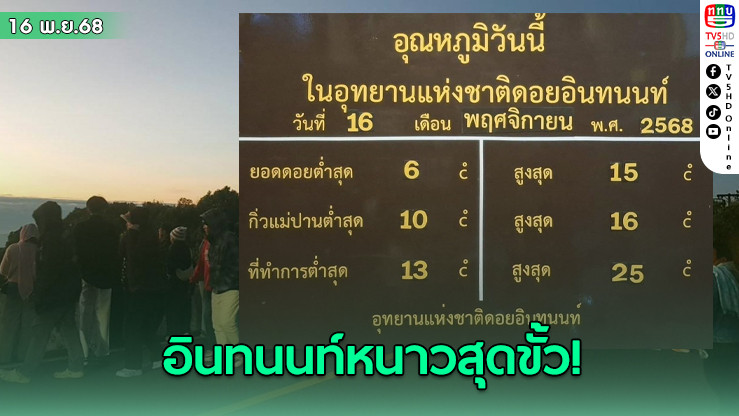 อุณหภูมิยอดดอยอินทนนท์เช้านี้ลดฮวบเหลือเพียง 6°C นักท่องเที่ยวแห่ชมพระอาทิตย์ขึ้นเหนือทะเลหมอก และต่อคิวเดินเส้นทางศึกษาธรรมชาติกิ่วแม่ปานอย่างคึกคักรับฤดูหนาว