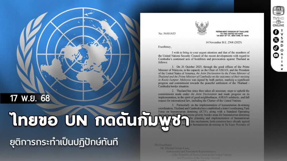 วันที่ 17 พ.ย.68 - นายเชิดชาย ใช้ไววิทย์ เอกอัครราชทูตผู้แทนถาวรไทยประจําสหประชาชาติ ณ นครนิวยอร์ก ได้ส่งจดหมายถึงประธานคณะมนตรีความมั่นคงแห่งสหประชาชาติ เพื่อขอให้เวียนจดหมายและเอกสารแนบไปยังสมาชิกฯ ทุกประเทศ เพื่อให้รับทราบข้อมูลล่าสุดเกี่ยวกับการกระทําต่อเนื่องของกัมพูชาที่ เป็นปฏิปักษ์และยั่วยุต่อประเทศไทย