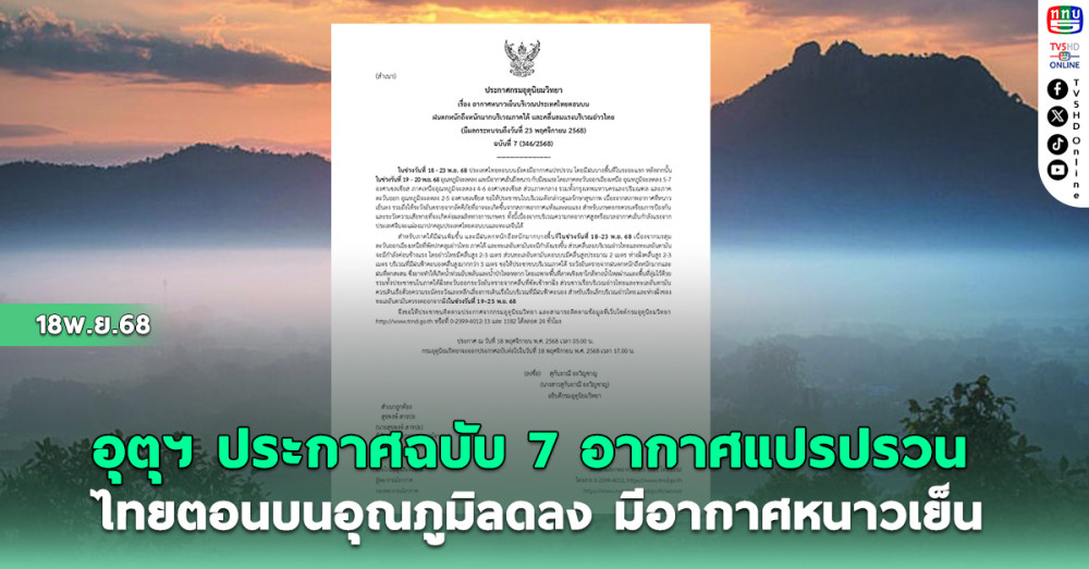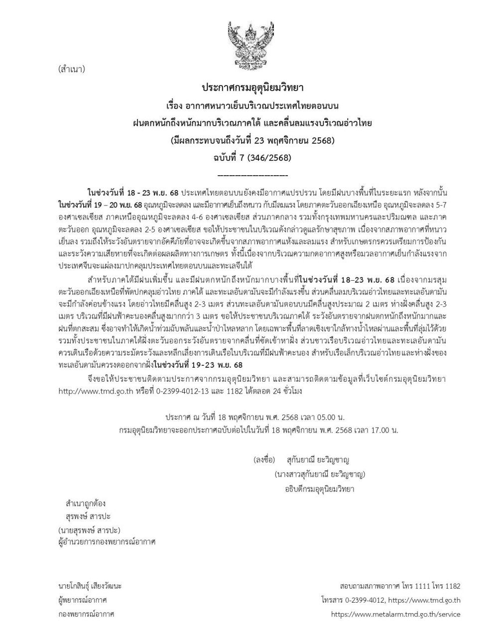 วันที่ 18 พ.ย.2568 กรมอุตุนิยมวิทยา ประกาศ เรื่อง อากาศหนาวเย็นบริเวณประเทศไทยตอนบน ฝนตกหนักถึงหนักมากบริเวณภาคใต้ และคลื่นลมแรงบริเวณอ่าวไทย (มีผลกระทบจนถึงวันที่ 23 พฤศจิกายน 2568) ฉบับที่ 7 ในช่วงวันที่ 18-23 พ.ย. 68 ประเทศไทยตอนบนยังคงมีอากาศแปรปรวน โดยมีฝนบางพื้นที่ในระยะแรก หลังจากนั้น ในช่วงวันที่ 19-20 พ.ย. 68 อุณหภูมิจะลดลง และมีอากาศเย็นถึงหนาว กับมีลมแรง