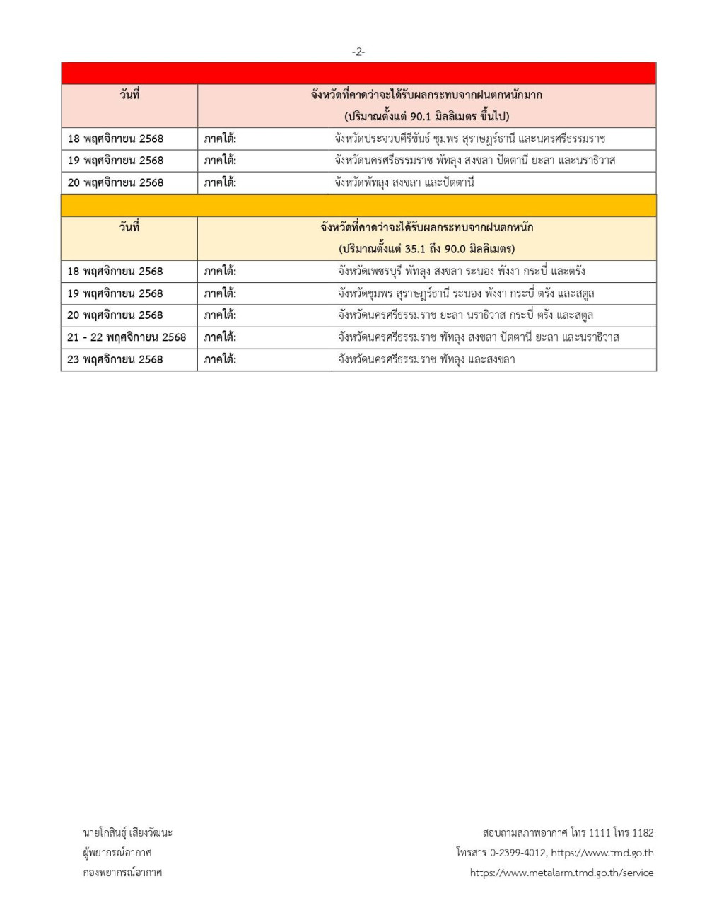 สําหรับภาคใต้มีฝนเพิ่มขึ้น และมีฝนตกหนักถึงหนักมากบางพื้นที่ในช่วงวันที่ 18–23 พ.ย. 68 เนื่องจากมรสุมตะวันออกเฉียงเหนือที่พัดปกคลุมอ่าวไทย ภาคใต้ และทะเลอันดามันจะมีกําลังแรงขึ้น