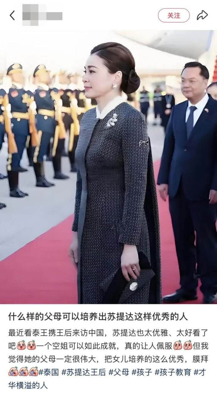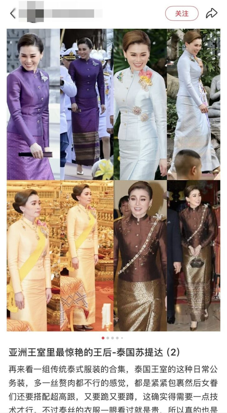โพสต์หนึ่งใน Xiaohongshu ระบุว่า พระองค์ทรงเป็นพระราชินีที่พระสิริโฉมที่สุดในบรรดาราชวงศ์ทวีปเอเชีย พร้อมกับเชิญให้ชมฉลองพระองค์ชุดไทยสมัยใหม่ที่พระองค์ทรงสวมใส่ด้วย โดยคอมเม้นท์หนึ่งในโพสต์นี้กล่าวว่า พระองค์ทรงมีพระปรีชาสามารถ โดยทรงสามารถขับเครื่องบิน เรือยอร์ชและวิ่งมาราธอนอีกด้วย
