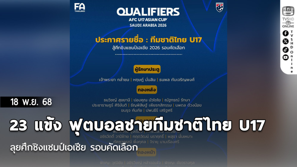 สมาคมกีฬาฟุตบอลแห่งประเทศไทย ในพระบรมราชูปถัมภ์ ประกาศรายชื่อ 23 นักฟุตบอลชายทีมชาติไทย รุ่นอายุไม่เกิน 17 ปี เก็บตัวฝึกซ้อม สําหรับทําการแข่งขันฟุตบอลชายชิงแชมป์เอเชียรุ่นอายุไม่เกิน 17 ปี รอบคัดเลือก (AFC U17 Asian Cup Saudi Arabia 2026 Qualifiers) ระหว่างวันที่ 22-30 พฤศจิกายน 2568