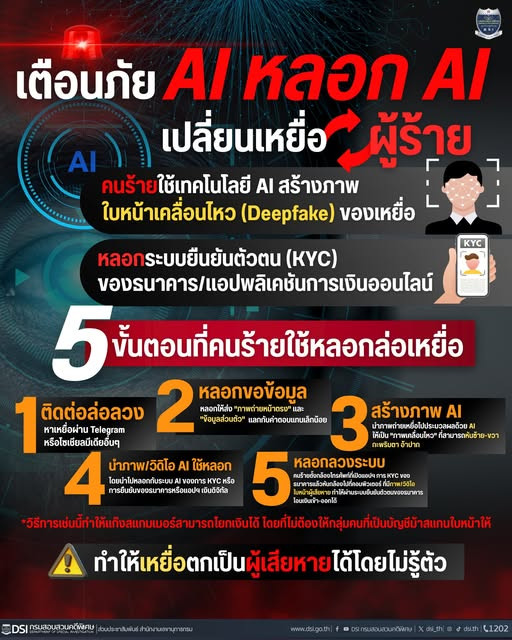 จากเหยื่อ...สู่ผู้ร้าย! DSI เตือนภัย AI หลอก AI หรือการใช้เทคโนโลยี Deepfake สร้างภาพเคลื่อนไหวใบหน้าของเหยื่อเพื่อหลอกระบบธนาคาร 5 ขั้นตอนที่คนร้ายใช้ในการโจมตี