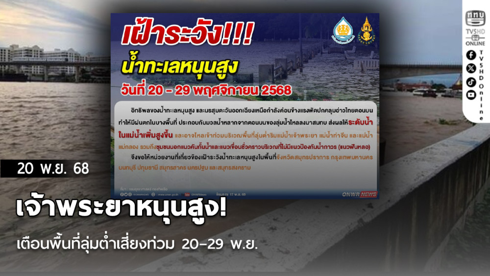 สนทช. เฝ้าระวังน้ําทะเลหนุนสูง 20–29 พ.ย. คาดแตะ 2 เมตร กระทบพื้นที่ลุ่มต่ําริมเจ้าพระยา–ท่าจีน–แม่กลอง เสี่ยงน้ําเอ่อท่วมชุมชนนอกแนวคันกั้นน้ําหลายจังหวัด