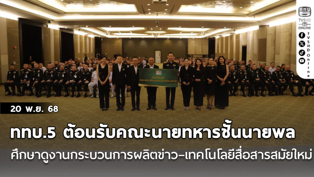 วันที่ 20 พ.ย.68 - สถานีวิทยุโทรทัศน์กองทัพบก หรือ ททบ.5 เปิดบ้านต้อนรับคณะนายทหารชั้นนายพลของกองทัพไทย รุ่นที่ 50 ประจําปี 2569 ในโอกาสเข้าศึกษาดูงานกระบวนการผลิตข่าวและระบบสื่อสารยุคใหม่ โดยมี พลโท อาวุธ พุทธอํานวย กรรมการผู้อํานวยการใหญ่ สถานีวิทยุโทรทัศน์กองทัพบก ให้เกียรติให้การต้อนรับ และ พลอากาศตรี ศราวุธ เมาลานนท์ รองเสนาธิการสถาบันวิชาการป้องกันประเทศ นําคณะนายทหารกว่า 300 นายร่วมศึกษาดูงานครั้งนี้