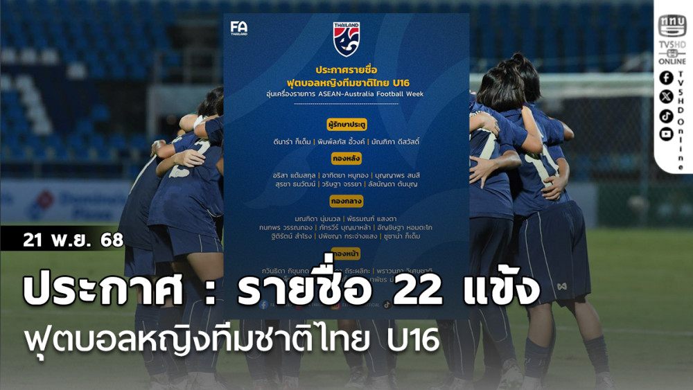 สมาคมกีฬาฟุตบอลแห่งประเทศไทย ในพระบรมราชูปถัมภ์ ประกาศรายชื่อ 22 นักฟุตบอลหญิงทีมชาติไทย รุ่นอายุไม่เกิน 16 ปี สําหรับทําการแข่งขันฟุตบอลหญิงรายการพิเศษ ASEAN-Australia Football Week ระหว่างวันที่ 22-28 พฤศจิกายน 2568 ณ นครซิดนีย์ ประเทศออสเตรเลีย ภายใต้การคุมทัพของ "โค้ชมิ่ม" ธิดารัตน์ วิวาสุขุ หัวหน้าผู้ฝึกสอน