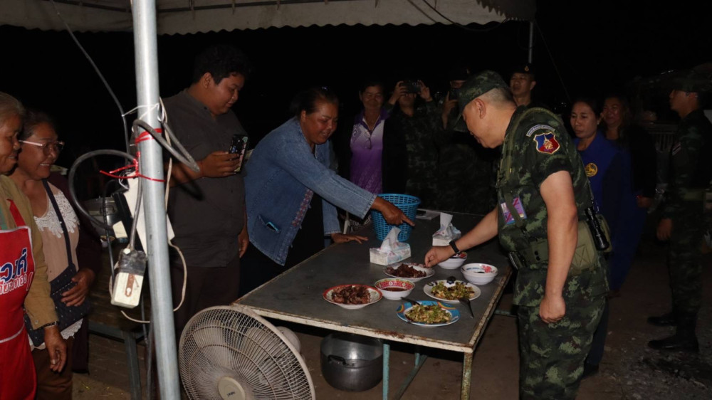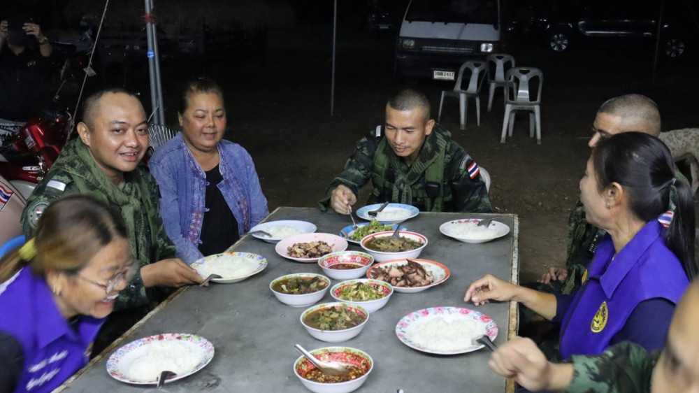 หลังจากนั้น พ.อ.บัญชา ชาญฉลาด รองผู้บัญชาการกองกําลังบูรพา และรองผู้บังคับหน่วยเฉพาะกิจที่ 12 ที่ร่วมคณะในครั้งนี้ ได้อยู่ร่วมรับประทานอาหารกับชาวบ้าน ณ จุดตรวจรักษาความปลอดภัยหมู่บ้านหนองหญ้าแก้ว ทั้งเพื่อสร้างความอบอุ่นใจ และเพื่อรับฟังปัญหา–ข้อเสนอแนะจากประชาชนโดยตรง บรรยากาศเป็นกันเองและอบอุ่น สวนทางกับอากาศที่เย็นลงในช่วงนี้