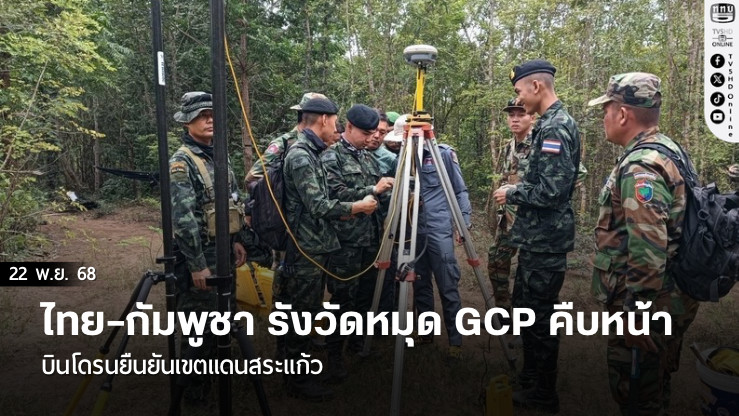 ทีมสํารวจและจัดทําหลักเขตแดนร่วมไทย–กัมพูชา เดินหน้าสํารวจพื้นที่ชายแดน จ.สระแก้ว ที่จุดตรวจ 34 บ้านหนองหญ้าแก้ว รังวัดหมุด GCP และบินโดรนบันทึกภาพภูมิประเทศประกอบการจัดทําแผนผังเขตแดน โดยทีมโฆษกกองทัพไทย รายงาน การปฏิบัติงานร่วมของกองกําลังบูรพา หน่วยสํารวจหลักเขตแดนไทย–กัมพูชา พร้อมฝ่ายปกครองจังหวัดสระแก้วและอําเภอโคกสูง กว่า 35 นาย ได้ดําเนินงานต่อเนื่องตั้งแต่เมื่อวานนี้ (21 พ.ย. 68) โดยทํางานร่วมกับฝ่ายกัมพูชาในพื้นที่ระหว่างหลักเขตแดนที่ 42 ถึง 43 ซึ่งเป็นช่วงแรกของการสํารวจ ทําการกรุยแนวและวางจุด GCP ได้ 16 จุด พร้อมรังวัดด้วยระบบ GPS อีก 16 หมุด รวมถึงบินโดรนเก็บภาพพื้นที่จํานวน 2 เที่ยวบิน ระยะทาง 1.3 กิโลเมตร