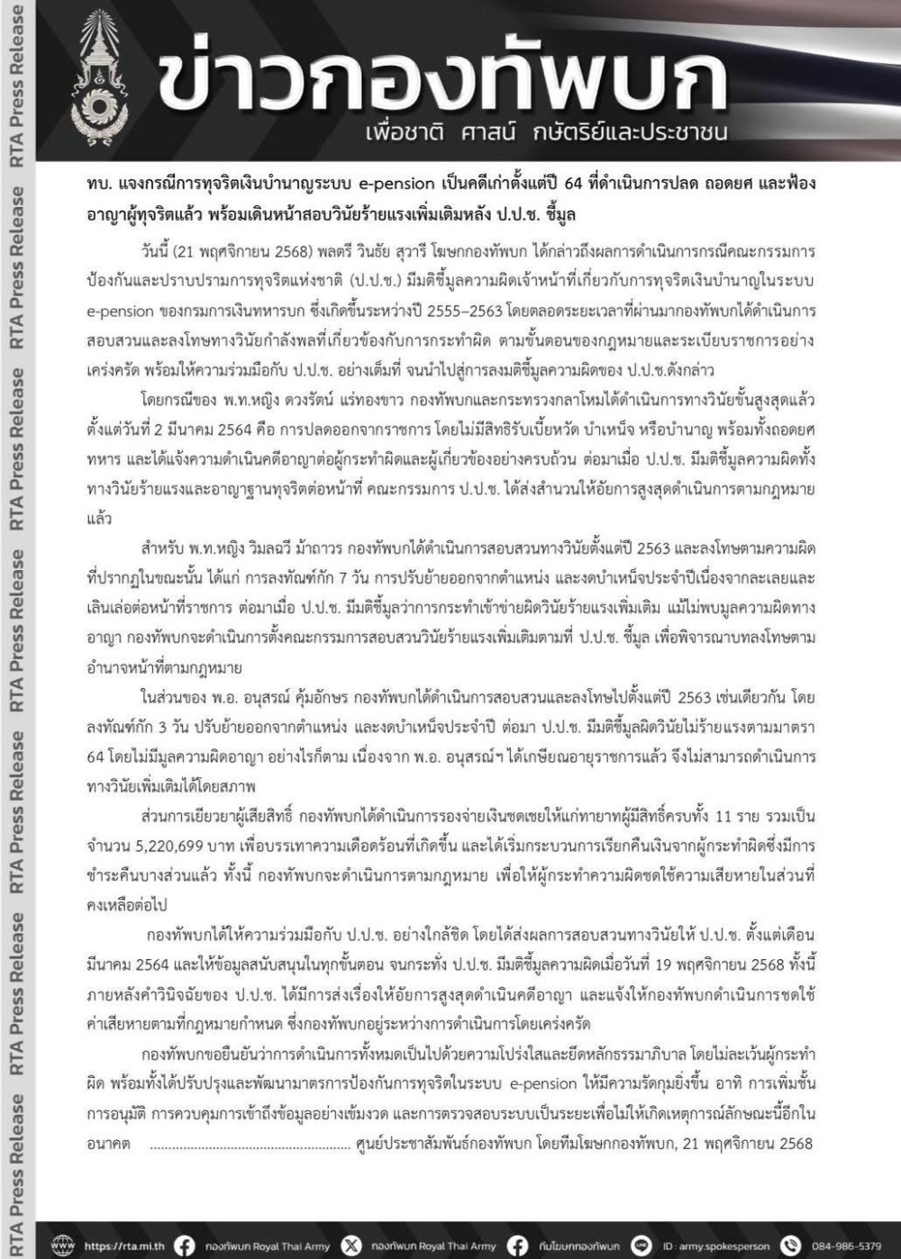 ทบ. แจงกรณีการทุจริตเงินบํานาญระบบ e-pension เป็นคดีเก่าตั้งแต่ปี 64 ที่ดําเนินการปลด ถอดยศ และฟ้องอาญาผู้ทุจริตแล้ว พร้อมเดินหน้าสอบวินัยร้ายแรงเพิ่มเติมหลัง ป.ป.ช. ชี้มูล