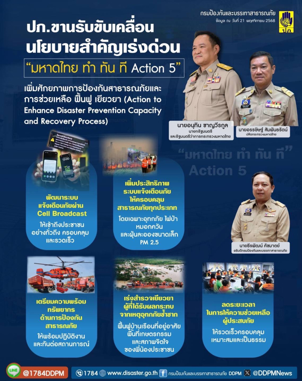 กรมป้องกันและบรรเทาสาธารณภัย (ปภ.) ซึ่งเป็นหนึ่งในหน่วยงานสังกัดกระทรวงมหาดไทย ที่มีบทบาทหน้าที่สําคัญในฐานะหน่วยงานกลางของรัฐในการป้องกันและบรรเทาสาธารณภัยของประเทศ จึงได้ขานรับนโยบายสําคัญเร่งด่วน “มหาดไทย ทํา ทัน ที Action 5” เพิ่มศักยภาพการป้องกันสาธารณภัยและการช่วยเหลือ ฟื้นฟู ที่ได้กําหนดไว้ 5 แนวทาง ได้แก่