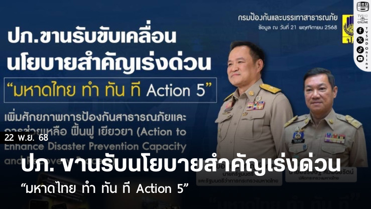 ปภ. ขานรับนโยบายสําคัญเร่งด่วน “มหาดไทย ทํา ทัน ที Action 5” เดินหน้าภารกิจด้านภัยพิบัติ เพิ่มศักยภาพการป้องกัน ช่วยเหลือ ฟื้นฟู เยียวยา บําบัดทุกข์ บํารุงสุข ประชาชน