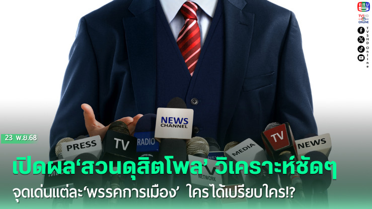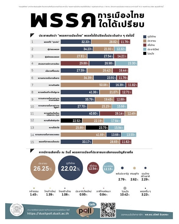 23 พฤศจิกายน 2568 “สวนดุสิตโพล” มหาวิทยาลัยสวนดุสิต เปิดเผยผลสํารวจความคิดเห็นประชาชนทั่วประเทศ เรื่อง “พรรคการเมืองไทย พรรคใดได้เปรียบ” กลุ่มตัวอย่าง จํานวน 1,794 คน (สํารวจทางออนไลน์และภาคสนาม) ระหว่างวันที่ 19-21 พฤศจิกายน 2568 พบว่า