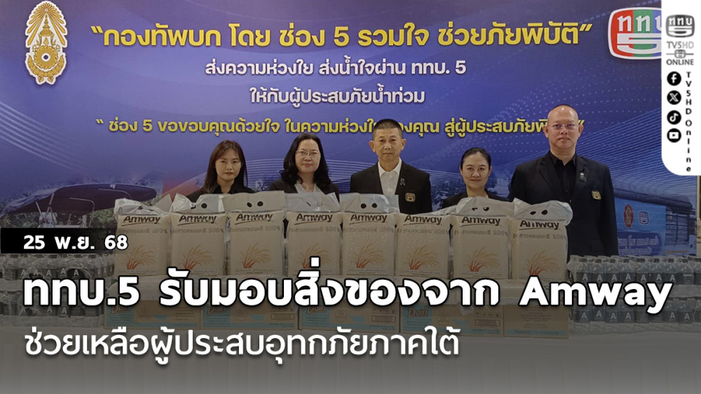 สถานีวิทยุโทรทัศน์กองทัพบก (ททบ.5) รับมอบข้าวสาร พร้อมนมและน้ําดื่ม จากบริษัท แอมเวย์ (ประเทศไทย) จํากัด เพื่อนําไปช่วยเหลือประชาชนที่ได้รับผลกระทบจากสถานการณ์อุทกภัยในพื้นที่ภาคใต้ โดย ททบ.5 จะกระจายสิ่งของผ่านโครงการ “กองทัพบกโดย ช่อง 5 รวมใจ ช่วยภัยพิบัติ” รวมถึงให้การประสานงานช่วยเหลือผ่านสายด่วนตลอด 24 ชั่วโมง