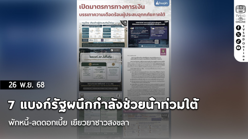 7 แบงก์รัฐขานรับนโยบาย อุ้มลูกหนี้น้ําท่วมสงขลา-ภาคใต้ พักชําระหนี้-เติมทุนฟื้นฟู เปิดช่องทางเยียวยาด่วนสําหรับรายย่อยและ SMEs ผ่านมาตรการลดดอกเบี้ย-ผ่อนปรนค่างวด พร้อมปล่อยกู้ฉุกเฉินเสริมสภาพคล่อง