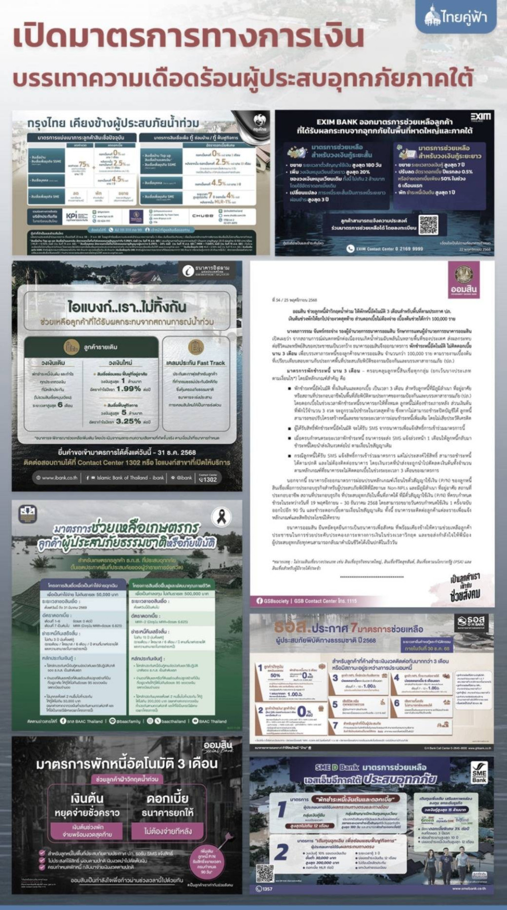 จากสถานการณ์อุทกภัยที่เกิดขึ้นในจังหวัดสงขลาและพื้นที่ภาคใต้ รัฐบาลได้เร่งออกมาตรการบรรเทาความเดือดร้อนให้แก่ประชาชนและภาคธุรกิจ โดยประสานความร่วมมือกับสถาบันการเงินต่าง ๆ เพื่อให้ความช่วยเหลือทางการเงินแก่ลูกค้าทั้งกลุ่มบุคคลธรรมดาและผู้ประกอบการวิสาหกิจขนาดกลางและขนาดย่อม (SME) ที่ได้รับผลกระทบ