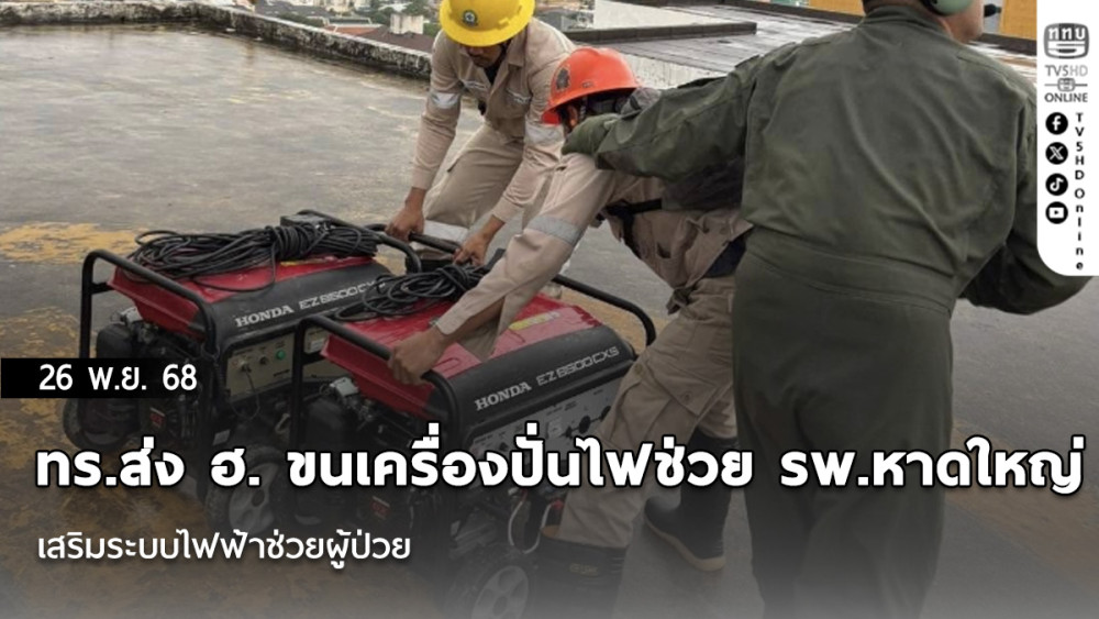 ทัพเรือภาคที่ 2 ส่งเฮลิคอปเตอร์ลําเลียงเครื่องปั่นไฟ PEA เสริมระบบพลังงาน 2 เครื่อง ที่รพ.หาดใหญ่ เพื่อพยุงระบบรักษาพยาบาลผู้ป่วย พร้อมแจ้งสายด่วนรับแจ้งเหตุอุทกภัยตลอด 24 ชั่วโมง