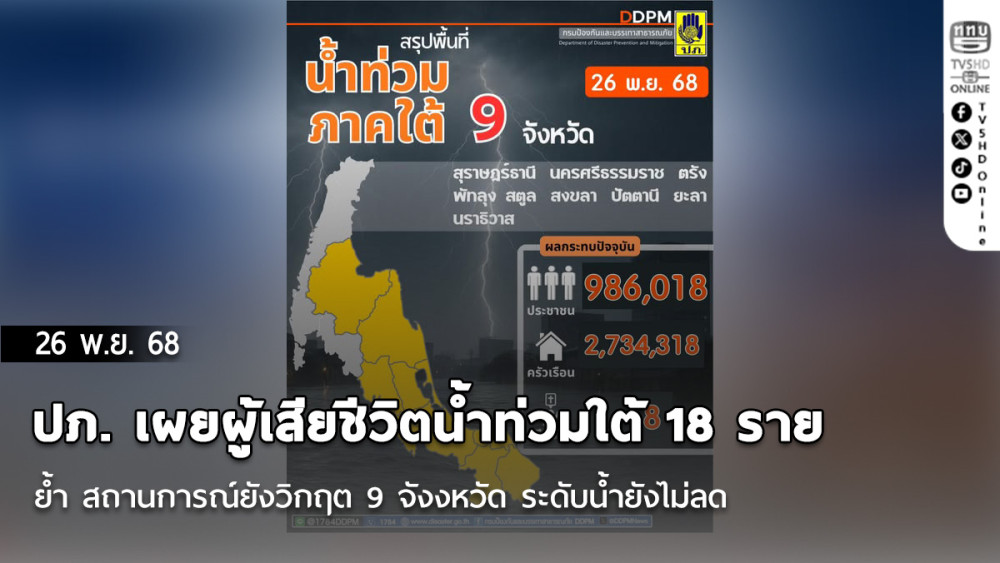ปภ. อัปเดตสถานการณ์น้ํา 26 พ.ย. "ภาคใต้" 9 จังหวัดระดับน้ํายังพุ่ง สูญเสียแล้ว 18 ราย ส่วนยอดผู้เสียชีวิตสะสมทั่วประเทศ 46 ราย เร่งตั้งศูนย์บัญชาการส่วนหน้าที่สงขลา ระดม ฮ.KA-32 และเครื่องจักรกลหนักกู้วิกฤตภาคใต้ ด้านภาคกลาง 11 จังหวัดน้ําลดลงต่อเนื่อง