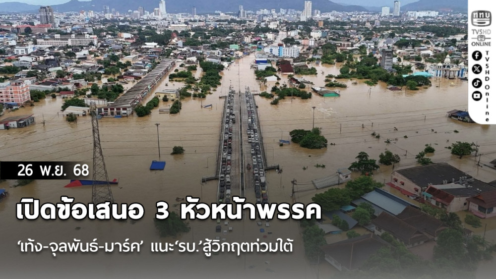 หมายเหตุ – จากสถานการณ์อุทกภัยภาคใต้เข้าขั้นวิกฤต มีข้อเสนอแนะเร่งด่วนจาก 3 หัวหน้าพรรคการเมือง เพื่อรับมือกับสถานการณ์ดังกล่าว เมื่อวันที่ 25 พฤศจิกายน