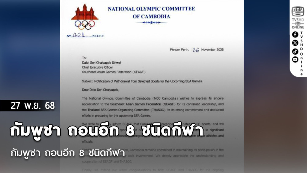 คณะกรรมการโอลิมปิค กัมพูชา ส่งจดหมายถึง สหพันธ์ซีเกมส์ แจ้งขอถอนตัว 8 ชนิดกีฬา ในการแข่งขันกีฬาซีเกมส์ ครั้งที่ 33 ที่ประเทศไทย จะเป็นเจ้าภาพ ระหว่างวันที่ 9-20 ธ.ค.นี้