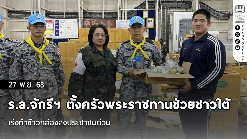 ร.ล.จักรีนฤเบศร ทอดสมอสงขลา เดินเครื่องโรงครัวพระราชทานบนเรือ ปรุงอาหาร-น้ําดื่ม 3,000 ชุด ใช้เฮลิคอปเตอร์ลําเลียงส่งพื้นที่วิกฤตที่รถเข้าไม่ถึง พร้อมปักหลักช่วยจนสถานการณ์คลี่คลาย