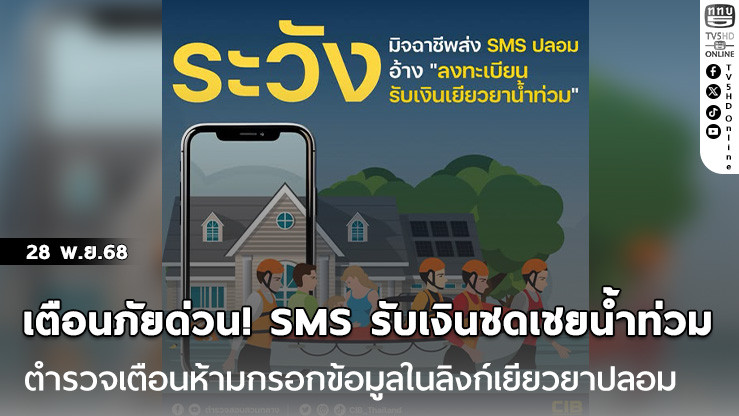 ตํารวจสอบสวนกลาง (CIB) ได้ออกประกาศเตือนภัยประชาชนในพื้นที่ประสบอุทกภัย โดยเฉพาะในภาคใต้ ให้ระมัดระวังกลุ่มมิจฉาชีพที่ฉวยโอกาสซ้ําเติมความเดือดร้อน ด้วยการส่งข้อความสั้น (SMS) หรือข้อความผ่านแอปพลิเคชันไลน์ (LINE) ในลักษณะหลอกลวง