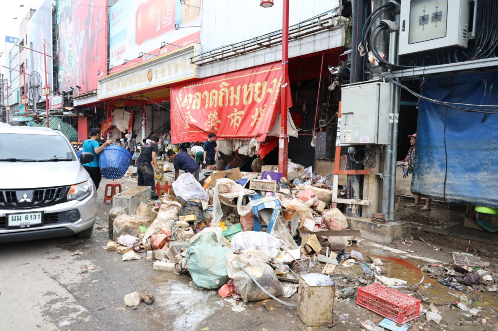 ด้านสถานการณ์ในพื้นที่เศรษฐกิจสําคัญอย่างตลาดกิมหยง อําเภอหาดใหญ่ ภายหลังระดับน้ําลดลง ได้เผยให้เห็นความเสียหายเป็นวงกว้าง ผู้ประกอบการและประชาชนได้เริ่มขนย้ายสินค้าและทรัพย์สินที่ถูกน้ําท่วมออกมาทําความสะอาด แต่ประสบปัญหาขาดแคลนน้ําสะอาดและอุปกรณ์ทําความสะอาด ขณะที่ระบบไฟฟ้ายังไม่สามารถใช้งานได้ ทําให้การฟื้นฟูเป็นไปอย่างล่าช้า สภาพพื้นที่โดยรอบยังคงเต็มไปด้วยโคลนและเศษซากปรักหักพังที่ถูกน้ําพัดมาทับถมกัน อีกทั้งยังเริ่มส่งกลิ่นเหม็นจากสิ่งปฏิกูลที่ตกค้าง