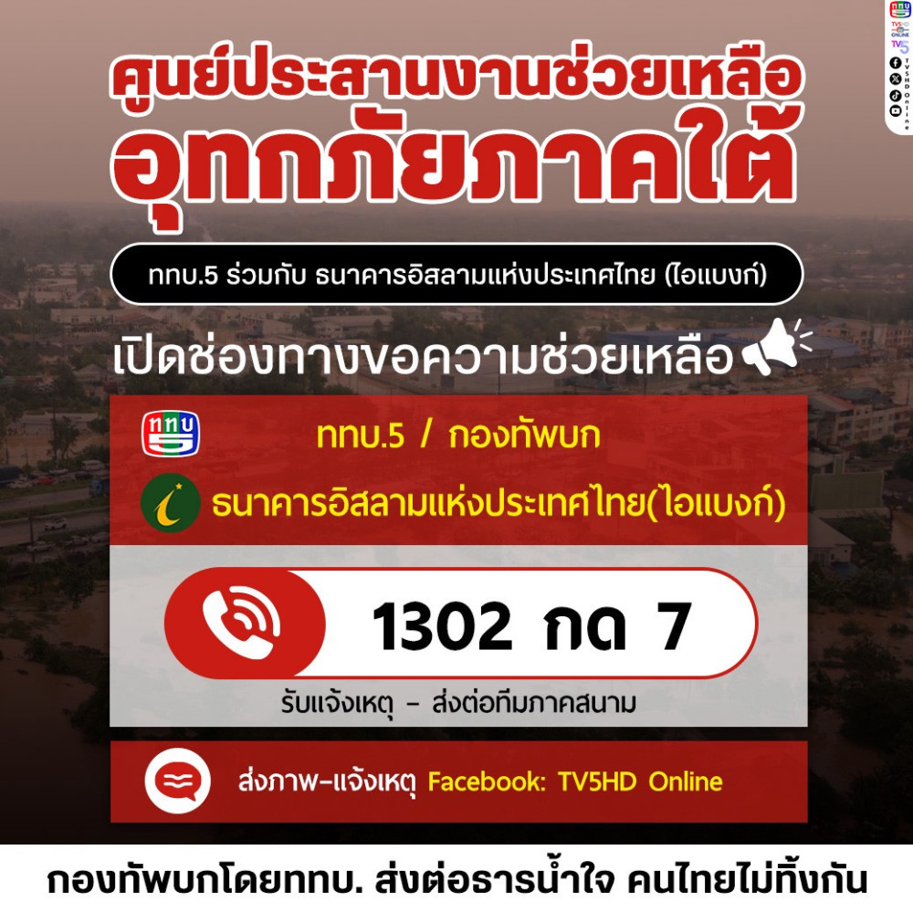 ททบ.5–ไอแบงก์–สภาเครือข่ายช่วยเหลือด้านมนุษยธรรม รวมพลังช่วยน้ําท่วมใต้ เปิดศูนย์เฉพาะกิจ รับแจ้งเหตุ–กระจายถุงยังชีพฮาลาล–ตั้งโรงครัว–ออกมาตรการช่วยประชาชนอย่างเร่งด่วน